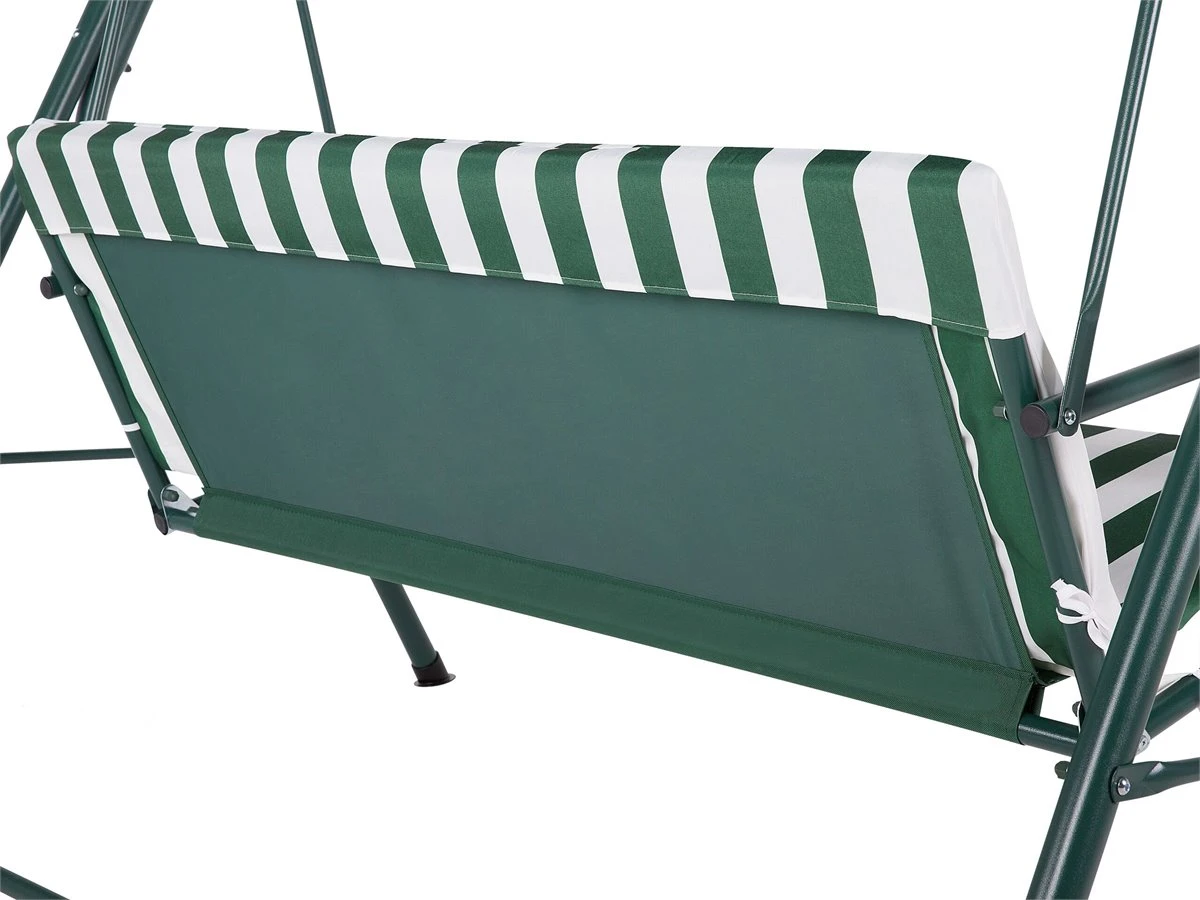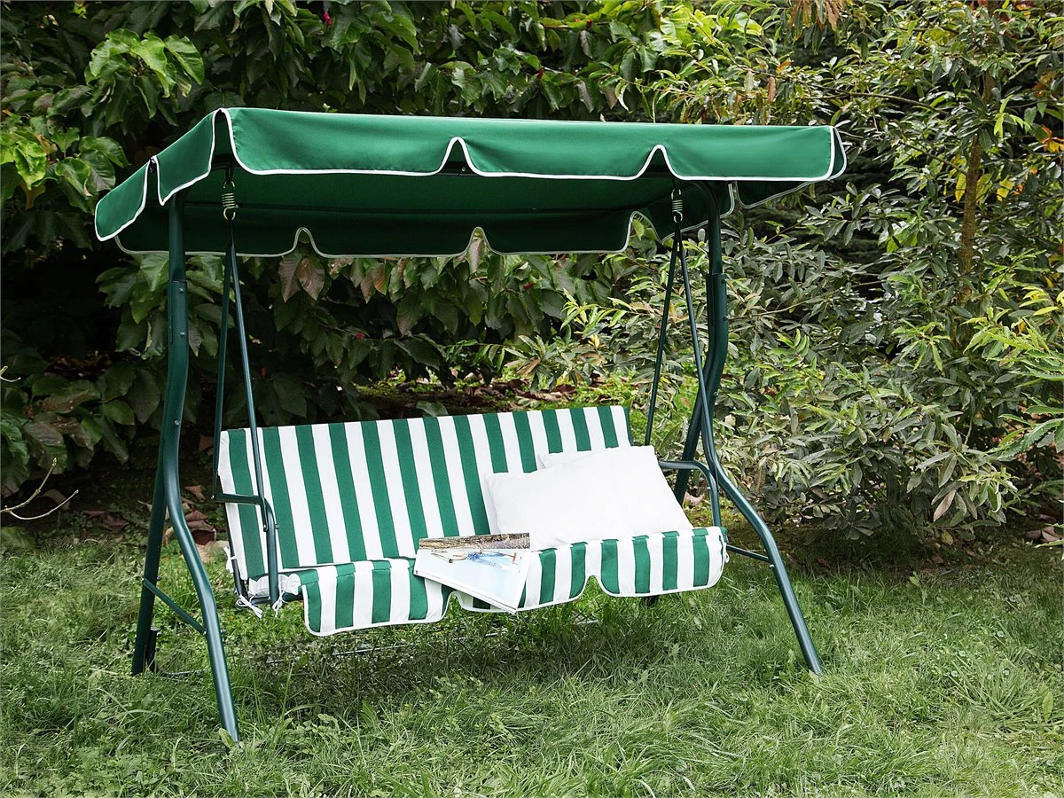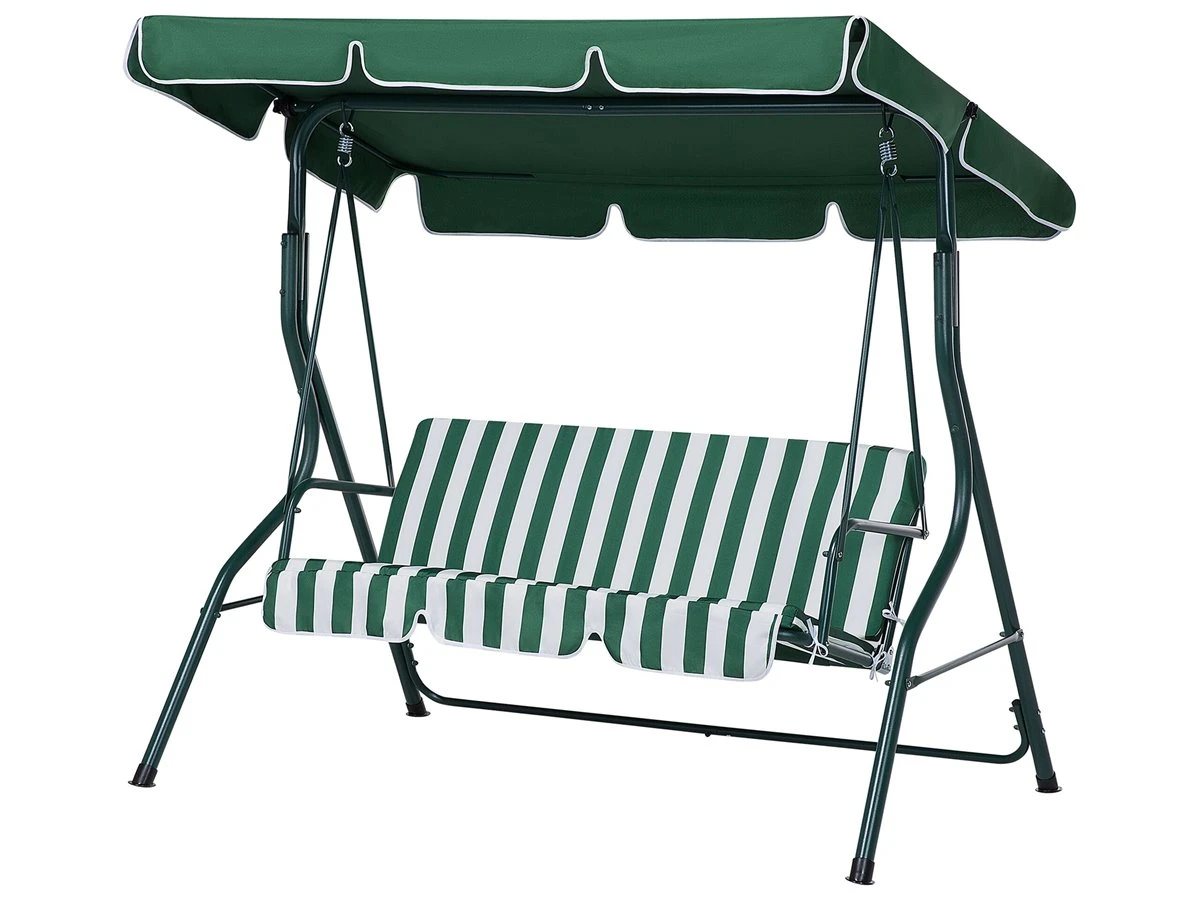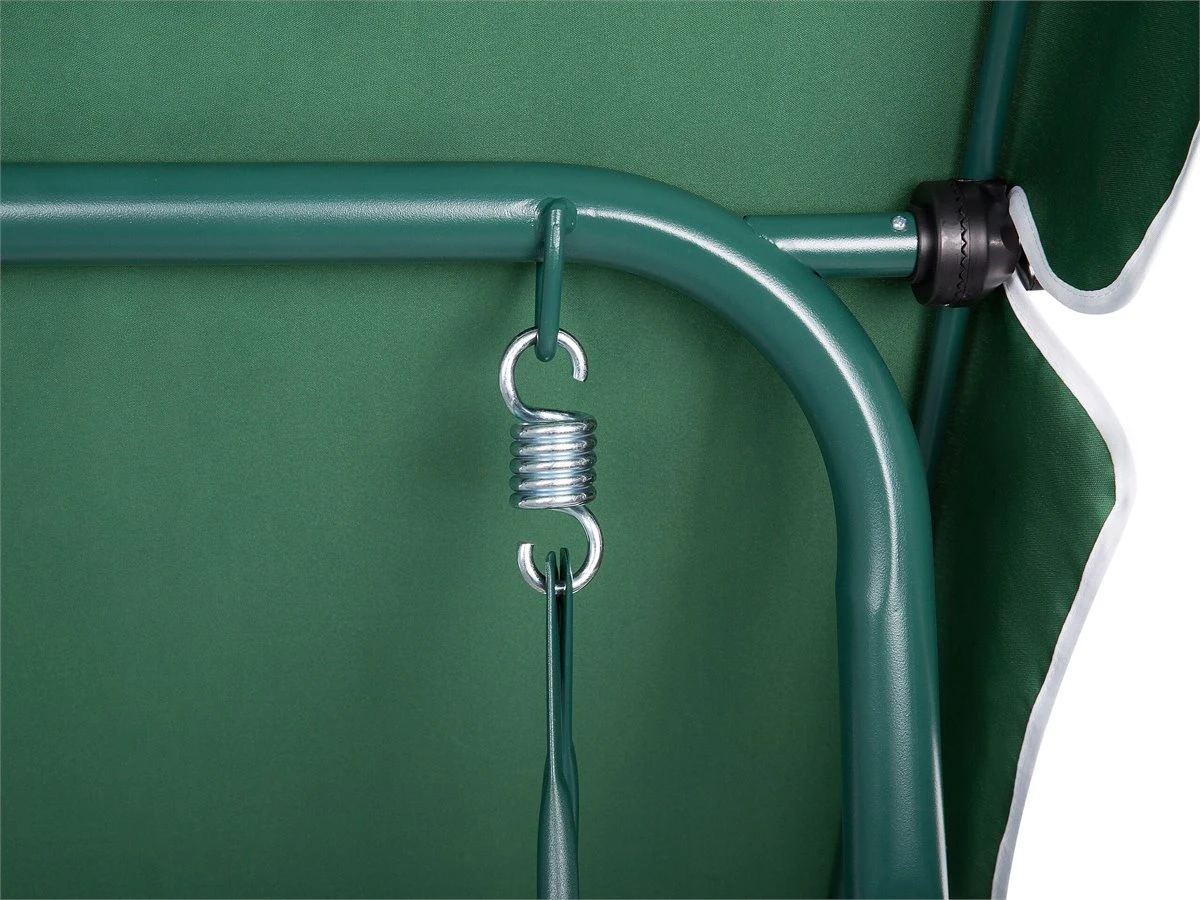 Columpio de jardín. Este columpio de jardín combina bien con cualquier decoración moderna. Está fabricado de acero con recubrimiento en polvo que garantiza durabilidad y estabilidad. El dosel de fibra sintética es resistente a las manchas y aporta un toque de relajación en los días más soleados. El respaldo alto y los asientos acolchados garantizan la máxima comodidad al sentarse. Detalles: Tipo de Producto: Columpio Estilo: Retro Color: Verde Tipo de material: Acero Material principal: Acero Material adicional: Poliéster Composición del Material: 100% Poliéster Acabado: Revestimiento en polvo Dimensiones: Altura del apoyabrazos: 18 cm Profundidad: 118 cm Espesor del asiento: 6 cm Altura del asiento: 53 cm Ancho: 174 cm Altura: 147 cm Superficie del asiento: 115×41 cm Peso: 13 kg Capacidad de peso: 260 kg La oferta incluye: 1 x Columpio Ventajas: La práctica cubertura brindará protección contra el viento y el sol, Las tiras ofrecen una fijación segura, Perfecto para todo tipo de exterior, Resistencia UV 3 (ISO 105-B02, Construcción muy estable Información de montaje: Requiere montaje completo. Más de 60 min. Texto de resistencia: Gracias a su resistencia al agua, puedes utilizar el producto al aire libre y dejarlo a la intemperie durante lluvias ligeras. Si no es posible guardarlo en un lugar cerrado y protegido, recomendamos utilizar una funda protectora. La exposición prolongada a la humedad puede provocar daños en el mueble. Resistencia: Agua ligera / humedad Consejos de mantenimiento: Poliéster: 1.Limpiar con champú seco y una esponja húmeda o un limpiador suave 2.Cuando no esté en uso, manténgalo en un lugar limpio y seco para protegerlo de las condiciones atmosféricas 3.Aspire con un accesorio adecuado. Acero: 1.Los muebles de acero y sus elementos no deben exponerse al agua. De lo contrario, existe la posibilidad de que el agua oxidada salga de las tuberías del marco 2.Cuando no estén en uso, los muebles deben guardarse en el interior o bajo una cubierta protectora 3.Para aumentar la durabilidad del artículo, manténgalo seco y recuerde la limpieza regular 4.Cualquier daño a la capa de pintura exterior debe protegerse de la humedad 5.Para garantizar la protección contra la corrosión, evite los limpiadores alcalinos o ácidos. Después de limpiar, secar bien 6.Quite las tapas protectoras con regularidad para que salga todo el líquido, déjelas secar y utilice un spray anticorrosión si es necesario 7.Limpiar con detergentes suaves.
