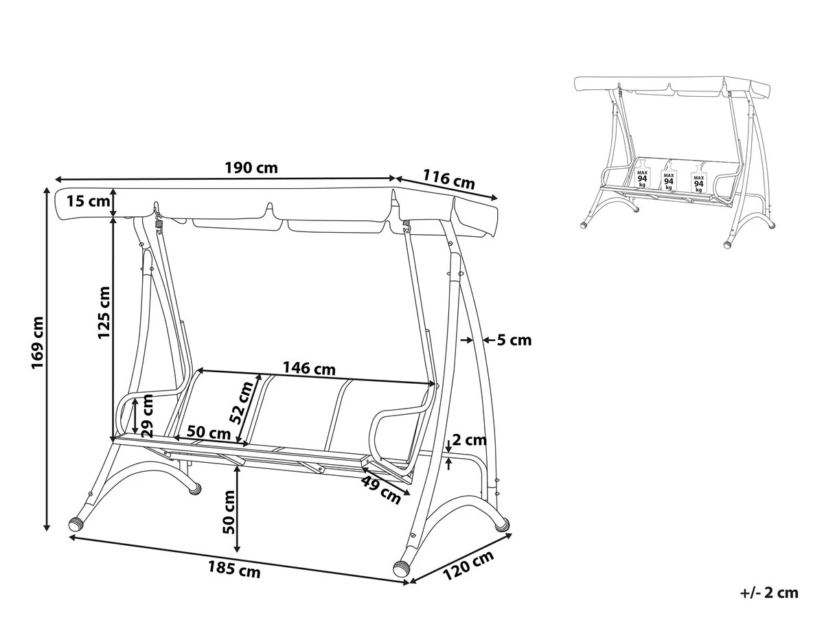Columpio de porche romántico. Cree un espacio de lujo para sus vacaciones con el columpio de jardín. El hermoso y robusto marco es elaborado a partir de acero con revestimiento en polvo resistente a la intemperie. El asiento para 3 personas y el respaldo están hechos de textil trenzado durable. El dosel ajustable proporciona una amplia sombra contra el sol. El columpio es fácil de mantener. Podrá disfrutar de los mejores momentos del verano con el columpio. Detalles: Tipo de Producto: Columpio Estilo: Moderno Color: Negro Tipo de material: Acero Material principal: Malla Material adicional: Poliéster Acabado: Revestimiento en polvo Dimensiones: Altura del apoyabrazos: 25 cm Profundidad: 120 cm Altura del asiento: 46 cm Ancho: 190 cm Altura: 169 cm Superficie del asiento: 146×49 cm Peso: 40 kg Capacidad de peso: 280 kg La oferta incluye: 1 x Columpio Ventajas: La práctica cubertura brindará protección contra el viento y el sol, Brinda comodidad y relajación, Ancha superficie del asiento, Perfecto para todo tipo de exterior, Resiste a todo tipo de clima, Construcción muy estable Información de montaje: Requiere montaje completo. Más de 60 min. Texto de resistencia: Gracias a su resistencia al agua, puedes utilizar el producto al aire libre y dejarlo a la intemperie durante lluvias ligeras. Si no es posible guardarlo en un lugar cerrado y protegido, recomendamos utilizar una funda protectora. La exposición prolongada a la humedad puede provocar daños en el mueble. Resistencia: Agua ligera / humedad Consejos de mantenimiento: Poliéster: 1.Cuando no esté en uso, manténgalo en un lugar limpio y seco para protegerlo de las condiciones atmosféricas 2.Aspire con un accesorio adecuado 3.Limpiar con champú seco y una esponja húmeda o un limpiador suave. Acero: 1.Cualquier daño a la capa de pintura exterior debe protegerse de la humedad 2.Para garantizar la protección contra la corrosión, evite los limpiadores alcalinos o ácidos. Después de limpiar, secar bien 3.Quite las tapas protectoras con regularidad para que salga todo el líquido, déjelas secar y utilice un spray anticorrosión si es necesario 4.Limpiar con detergentes suaves 5.Los muebles de acero y sus elementos no deben exponerse al agua. De lo contrario, existe la posibilidad de que el agua oxidada salga de las tuberías del marco 6.Cuando no estén en uso, los muebles deben guardarse en el interior o bajo una cubierta protectora 7.Para aumentar la durabilidad del artículo, manténgalo seco y recuerde la limpieza regular.