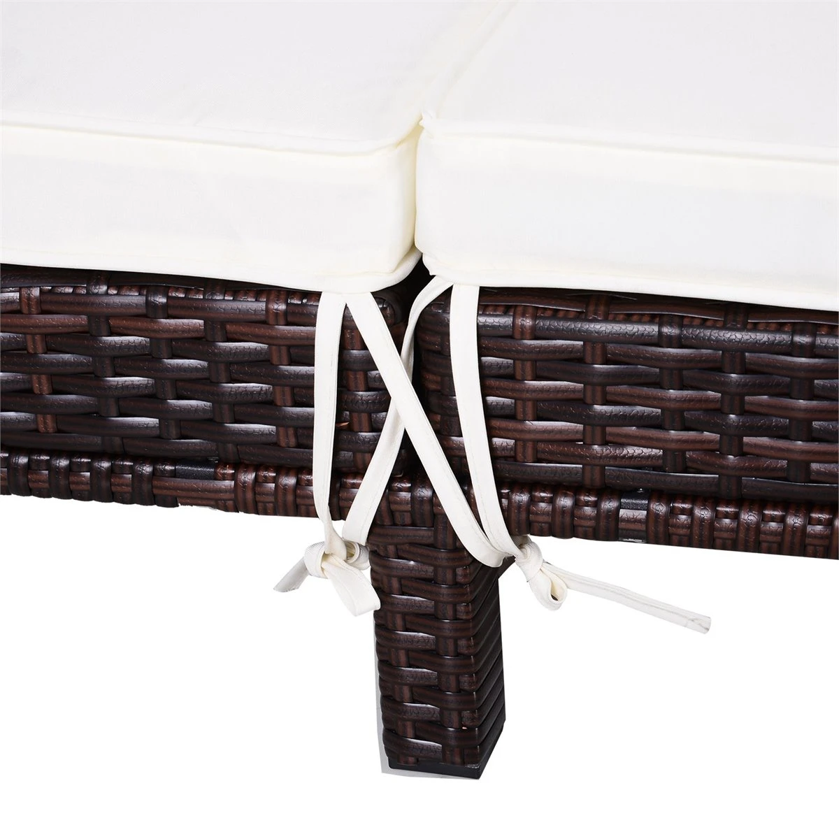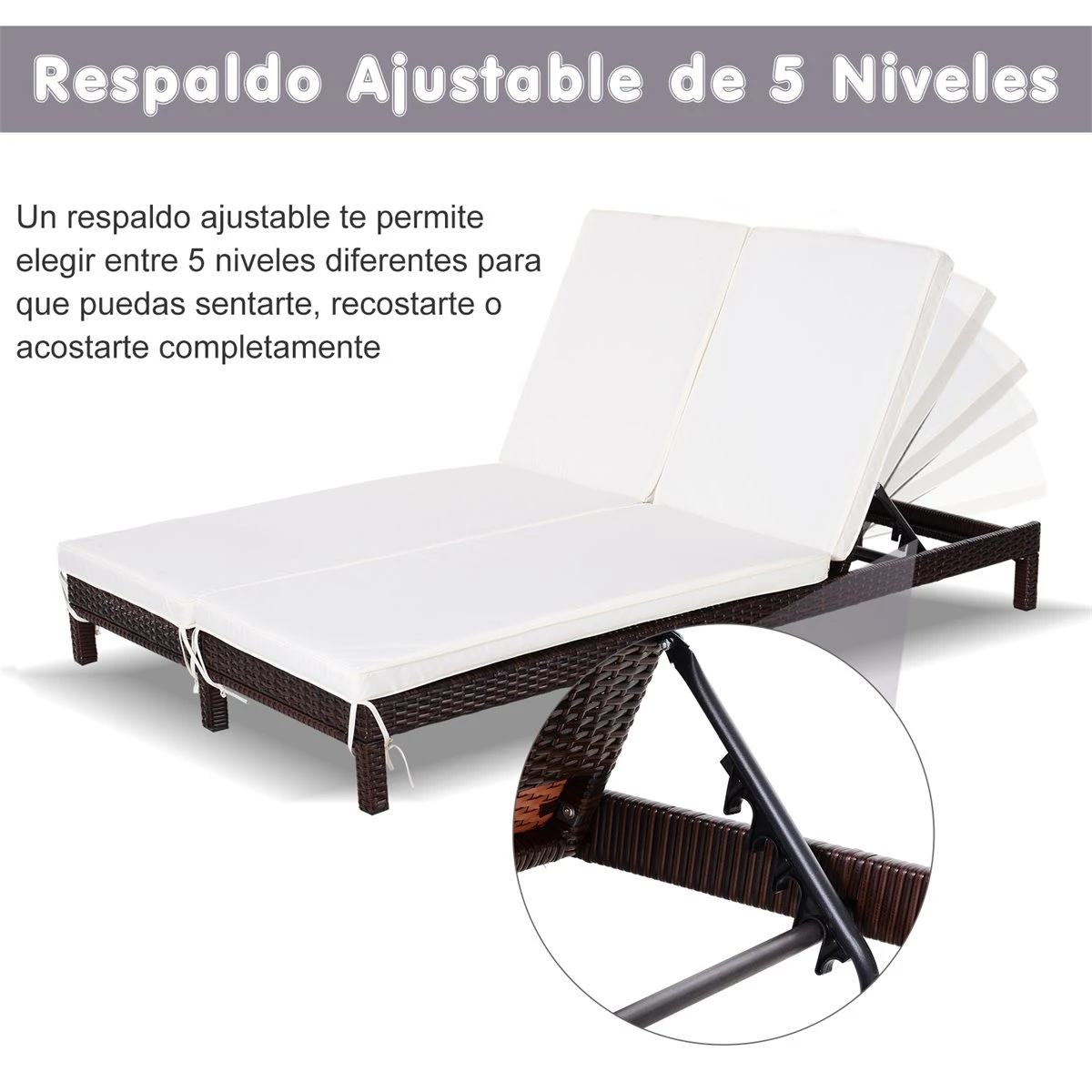 - – ELEGANTE DISEÑO 2 EN 1: Tumbona de jardín de diseño elegante y original con capacidad para 2 personas. Para disfrutar del buen tiempo en tu jardín, patio, terraza o cerca de la piscina solo o en compañía. Su diseño de líneas rectas y el color de la estructura y cojines combinará en cualquier entorno que lo coloques – RESPALDO RECLINABLE: Ambos asientos de esta tumbona doble cuenta con su correspondiente respaldo reclinable. Ajustables independientemente en 5 posiciones diferentes (63 cm, 71 cm, 79 cm, 86 cm y 91 cm para adaptar a cada situación – MÁXIMA COMODIDAD: Esta tumbona para 2 personas cuenta con 2 cojines de cuerpo entero, uno para cada asiento. Los cojines están enfundados en tejido de poliéster resistente al agua y relleno de algodón sintético para una comodidad óptima – ESTRUCTURA RESISTENTE: Tumbona de doble capacidad con estructura resistente de tubo galvanizado, con recubrimiento en polvo para mayor resistencia a la intemperie y a la corrosión. Envuelto de ratán sintético con fibra de PE, es duradero y resistente a los rayos UV – MEDIDAS TOTALES: 196x120x28 cm (LxANxAL. Medidas de cada asiento: 123x60x23 cm (LxANxAL. Peso máximo soportado: 220 kg. Se requiere montaje