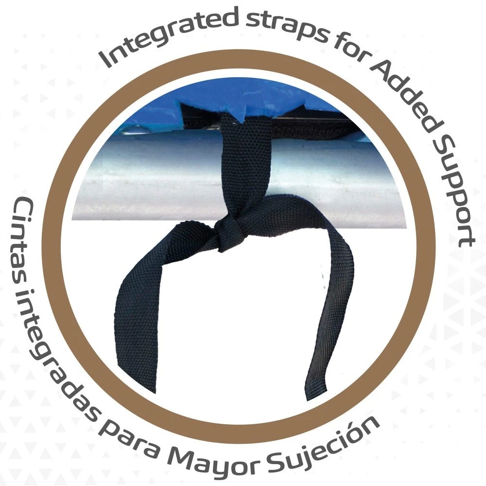 - Incorpora cierre regulable y cintas para atar a la estructura metálica