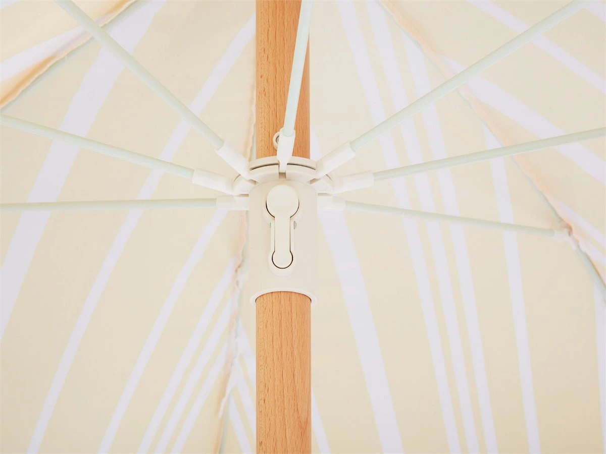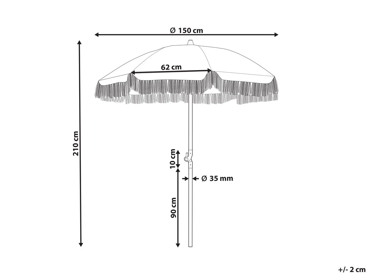 Sombrilla de diseño elegante. Dale un toque retro a tu zona exterior con esta sombrilla de jardín. Está fabricada a partir de tela de poliéster de alta calidad y resistente a los rayos UV. El poste de madera de haya es resistente y soporta condiciones climáticas adversas. La funda con asas facilita el mantenimiento y el transporte de un lugar a otro. Detalles: Tipo de Producto: Sombrilla Estilo: Retro Color: Blanco Tipo de material: Tejido Material principal: Poliéster Material adicional: Madera de haya Composición del Material: 100% Poliéster Forma: Redonda Rotación 360: No Placas: Sí LED: No Número de láminas: 8 Láminas: 8 Inclinación: Sí Mecanismo de abertura de la sombrilla: Manivela Dimensiones: Profundidad: 150 cm Ancho: 150 cm Diámetro del poste: 35 Altura: 210 cm Peso: 3.5 kg La oferta incluye: 1 x Funda de protección , 1 x Sombrilla, No incluye: base Ventajas: Mecanismo de abertura por manivela, Estilo retro, Resistencia UV 5 (ISO 105-B02, Resistente al agua gracias a los materiales de alta calidad, No requiere mantenimiento regular, Fabricación con materiales reciclados, Rápido y fácil de usar Información de montaje: No requiere montaje Información adicional: Debe tenerse en cuenta que el peso ideal de la base para la sombrilla es de unos 20-25 kg. De esta forma, la sombrilla podrá soportar vientos de hasta 25 km/h. Texto de resistencia: El producto está hecho con tela resistente a los rayos UV, lo que significa que se puede usar bajo la luz del sol sin preocuparse por la pérdida de color. En cualquier caso, es recomendable colocar los muebles debajo de una cubierta impermeable cuando no se utilicen, para asegurar su máxima durabilidad. Resistencia: Rayos UV Consejos de mantenimiento: Poliéster: 1.Limpiar con champú seco y una esponja húmeda o un limpiador suave 2.Cuando no esté en uso, manténgalo en un lugar limpio y seco para protegerlo de las condiciones atmosféricas 3.Aspire con un accesorio adecuado. Madera de haya: 1.Los muebles con acabado de aceite deben volverse a engrasar antes de ponerlos en uso y al menos una vez al año, especialmente en el clima húmedo 2.Limpiar con un limpiador suave y un paño suave en la dirección de la veta. Secar con un paño inmediatamente después de limpiar 3.Durante el invierno o en condiciones climáticas adversas, utilice una funda protectora o guarde los muebles en el interior.