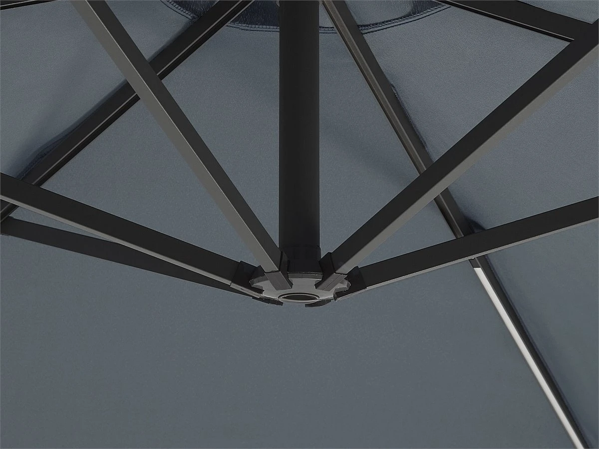 Sombrilla de jardín. Añade funcionalidad a tu zona exterior con esta sombrilla de jardín. Está fabricada a partir de tela de poliéster de alta calidad y resistente al agua. El poste de metal viene con una manivela que facilita la apertura y el cierre. Las luces LED en los travesaños aportan una luz suave generada a través de la energía solar. Detalles: Tipo de Producto: Sombrilla con iluminación LED Estilo: Moderno Color: Gris Tonalidad: Grafito Tipo de material: Metal Material principal: Poliéster Material adicional: Acero Composición del Material: 100% Poliéster Forma: Hexagonal Rotación 360: No Placas: No LED: Sí Número de láminas: 6 Láminas: 6 Inclinación: No Mecanismo de abertura de la sombrilla: Manivela Dimensiones: Profundidad: 285 cm Ancho: 285 cm Diámetro del poste: 50 Altura: 270 cm Peso: 10 kg La oferta incluye: 1 x Sombrilla, No incluye: base para la sombrilla Ventajas: Mecanismo de abertura por manivela, Pantalla giratoria e inclinable de 360°, Base en cruz para pesas en sombrillas, 100% impermeable, Resistencia UV 5 (ISO 105-B02, UPF 30+ (filtra el 96,7% de la radiación UV, Rápido y fácil de usar, Luces LED integradas Información de montaje: Requiere montaje parcial. 20-40 min. Información adicional: Debe tenerse en cuenta que el peso ideal de la base para la sombrilla es de unos 20-25 kg. De esta forma, la sombrilla podrá soportar vientos de hasta 25 km/h. Una vez que la sombrilla esté completamente cerrada o abierta, no continúes girando la manivela en la misma dirección, ya que podrías dañar el mecanismo. Texto de resistencia: El producto está hecho con tela resistente a los rayos UV, lo que significa que se puede usar bajo la luz del sol sin preocuparse por la pérdida de color. En cualquier caso, es recomendable colocar los muebles debajo de una cubierta impermeable cuando no se utilicen, para asegurar su máxima durabilidad. Resistencia: Rayos UV Consejos de mantenimiento: Acero: 1.Cualquier daño a la capa de pintura exterior debe protegerse de la humedad 2.Para garantizar la protección contra la corrosión, evite los limpiadores alcalinos o ácidos. Después de limpiar, secar bien 3.Quite las tapas protectoras con regularidad para que salga todo el líquido, déjelas secar y utilice un spray anticorrosión si es necesario 4.Limpiar con detergentes suaves 5.Los muebles de acero y sus elementos no deben exponerse al agua. De lo contrario, existe la posibilidad de que el agua oxidada salga de las tuberías del marco 6.Cuando no estén en uso, los muebles deben guardarse en el interior o bajo una cubierta protectora 7.Para aumentar la durabilidad del artículo, manténgalo seco y recuerde la limpieza regular. Poliéster: 1.Aspire con un accesorio adecuado 2.Limpiar con champú seco y una esponja húmeda o un limpiador suave 3.Cuando no esté en uso, manténgalo en un lugar limpio y seco para protegerlo de las condiciones atmosféricas.
