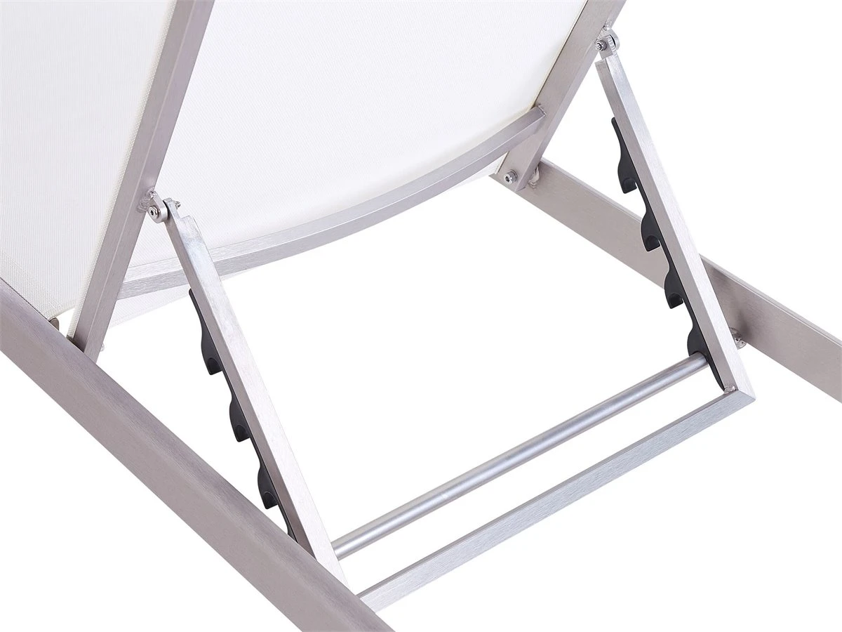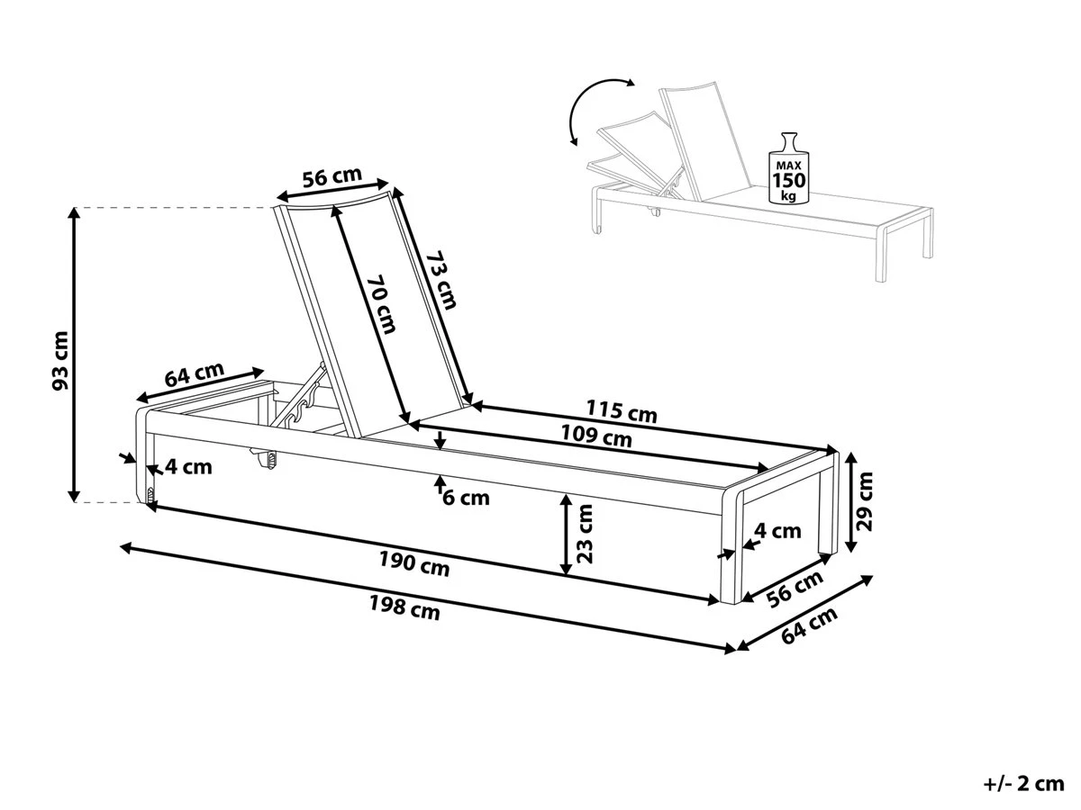 Tumbona de jardín en aluminio y textil . Añade a tu zona exterior esta tumbona moderna y versátil. Está fabricada a partir de aluminio pulido resistente y duradero. El asiento de textil trenzado flexible y resistente a los rayos UV combina bien con la estructura de metal. El respaldo ajustable proporciona la máxima comodidad. Las 2 ruedas facilitan el desplazamiento. Detalles: Tipo de Producto: Tumbona Estilo: Industrial Color: Blanco Tipo de material: Metal Material principal: Aluminio Composición del Material: 100% Textil trenzado Respaldo ajustable: Sí Apoyabrazo: No Acabado: Cepillado Plegable: No Dimensiones: Profundidad: 198 cm Altura del asiento: 29 cm Ancho: 64 cm Altura: 29-93 cm Peso: 14 kg Capacidad de peso: 150 kg La oferta incluye: 1 x Chaise longue Ventajas: Respaldo ajustable en 4 posiciones, Perfecto para todo tipo de exterior, Tapizado duradero antimanchas , Robusto marco resistente a la corrosión, Resistencia UV 4 (ISO 105-B05, Totalmente reclinable a la posición horizontal, Mantenimiento sencillo Información de montaje: Requiere montaje de las patas. 5-15 min. Texto de resistencia: El producto es resistente al agua, lo que significa que no se dañará expuesto a la lluvia o en contacto con otros líquidos. Puede dejarlo al aire libre incluso durante fuertes lluvias o humedad. Durante la temporada de invierno es recomendable almacenar el producto en el interior o bajo una cubierta impermeable. Resistencia: Agua Consejos de mantenimiento: Textil trenzado: 1.Limpiar con champú seco y una esponja húmeda o un limpiador suave 2.Cuando no esté en uso, manténgalo en un lugar limpio y seco para protegerlo de las condiciones atmosféricas 3.Aspire con un accesorio adecuado. Aluminio: 1.Limpiar con agua jabonosa y detergentes suaves. Quitar el polvo con un paño suave 2.Fuera de temporada, utilice una funda protectora o guarde los muebles en un lugar fresco y seco.