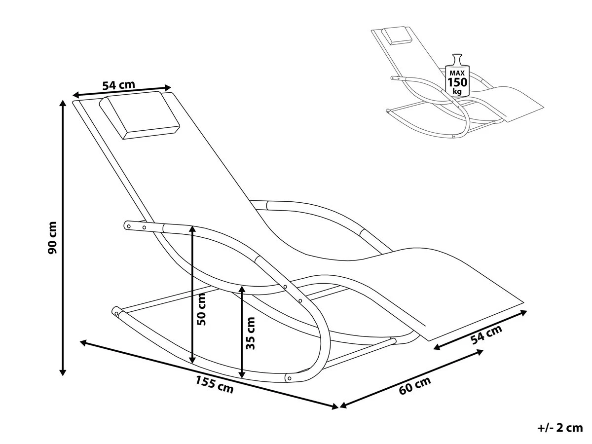 Tumbona de jardín mecedora. Esta tumbona de jardín mecedora de estilo contemporáneo es perfecta para cualquier jardín, balcón o patio. Los aros de acero permiten un balanceo suave y relajante. El asiento, fabricado de tela duradera, incluye un reposacabezas acolchado que aporta la mayor comodidad. Detalles: Tipo de Producto: Tumbona Estilo: Moderno Color: Beige Tipo de material: Acero Material principal: Acero Composición del Material: 90% PVC Respaldo ajustable: No Apoyabrazo: Sí Acabado: Revestimiento en polvo Plegable: No Dimensiones: Altura del apoyabrazos: 50 cm Profundidad: 155 cm Altura del asiento: 35 cm Ancho: 60 cm Altura: 90 cm Peso: 10 kg Capacidad de peso: 150 kg La oferta incluye: 1 x Tumbona de exterior Ventajas: Agradable función de balanceo, Con un cómodo reposacabezas, Brinda comodidad y relajación, Perfecto para todo tipo de exterior, Material ligero y durable, Mantenimiento sencillo Información de montaje: Requiere montaje completo. 20-40 min. Información adicional: El tejido textilene es una excelente alternativa para cualquier otro material utilizado para muebles de exterior. Es mucho más duradero, repelente a la humedad y resistente a las manchas que los sustitutos disponibles. Sin embargo, se aconseja ensamblar los muebles de textilene a temperatura de ambiente, ya que hace que el material sea más flexible y fácil de montar. La baja temperatura puede hacer que el textilene se encoja y dificulte el ensamble de los muebles. Texto de resistencia: Gracias a su resistencia al agua, puedes utilizar el producto al aire libre y dejarlo a la intemperie durante lluvias ligeras. Si no es posible guardarlo en un lugar cerrado y protegido, recomendamos utilizar una funda protectora. La exposición prolongada a la humedad puede provocar daños en el mueble. Resistencia: Agua ligera / humedad Consejos de mantenimiento: Textil trenzado: 1.Aspire con un accesorio adecuado 2.Limpiar con champú seco y una esponja húmeda o un limpiador suave 3.Cuando no esté en uso, manténgalo en un lugar limpio y seco para protegerlo de las condiciones atmosféricas. Acero: 1.Quite las tapas protectoras con regularidad para que salga todo el líquido, déjelas secar y utilice un spray anticorrosión si es necesario 2.Limpiar con detergentes suaves 3.Los muebles de acero y sus elementos no deben exponerse al agua. De lo contrario, existe la posibilidad de que el agua oxidada salga de las tuberías del marco 4.Cuando no estén en uso, los muebles deben guardarse en el interior o bajo una cubierta protectora 5.Para aumentar la durabilidad del artículo, manténgalo seco y recuerde la limpieza regular 6.Cualquier daño a la capa de pintura exterior debe protegerse de la humedad 7.Para garantizar la protección contra la corrosión, evite los limpiadores alcalinos o ácidos. Después de limpiar, secar bien.