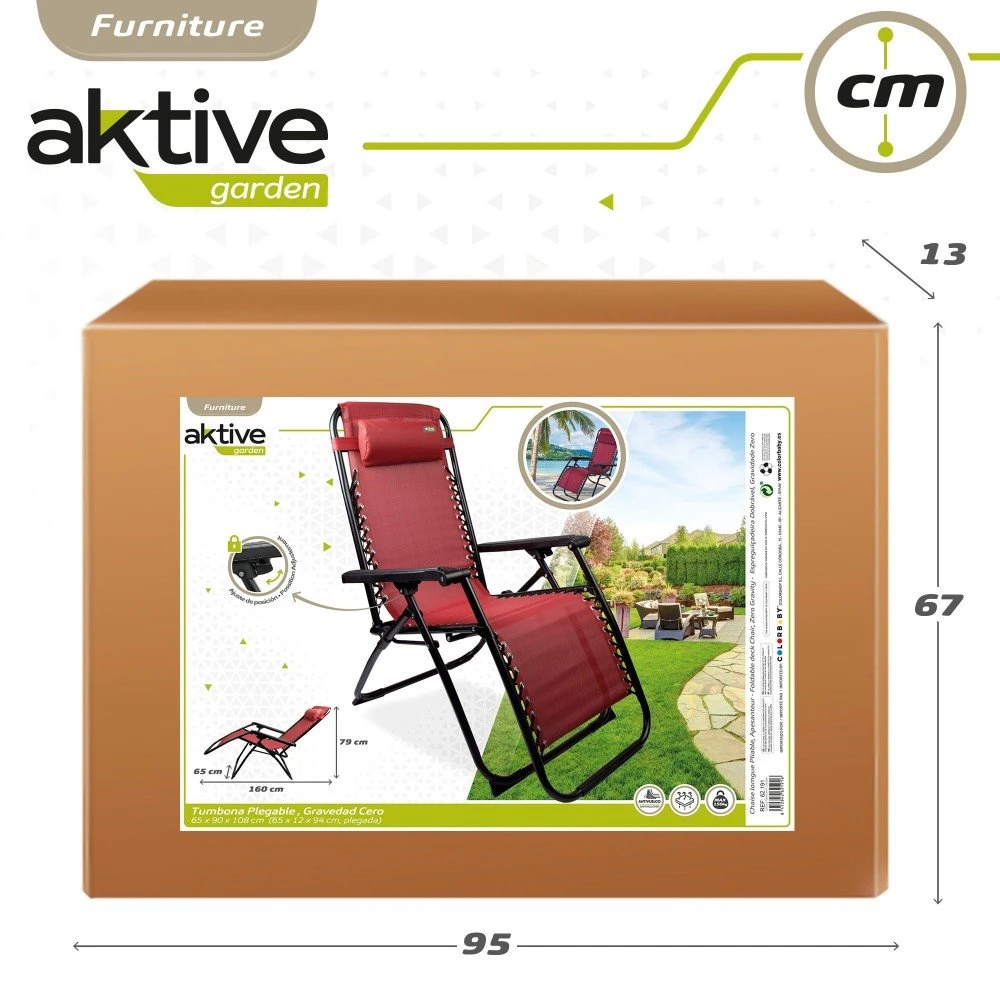 Tumbona Gravedad Cero Aktive Beach color burdeos. La tumbona mide en posición sentada 5,15 x 90 x 108 cm y reclinada 51,5 x 160 x 79 cm y la altura del suelo es de 42 cm. Es reclinable y plegable con asiento de textileno cosido con cuerdas a la estructura para una sensación de ingravidez y equilibrio única. Tiene una estructura robusta de acero cromado en negro de 2 cm de diámetro. Incluye cojín extraíble y regulable, reposabrazos rígidos de PVC y patas con topes antivuelco. Soporta hasta 150 kg de peso.
