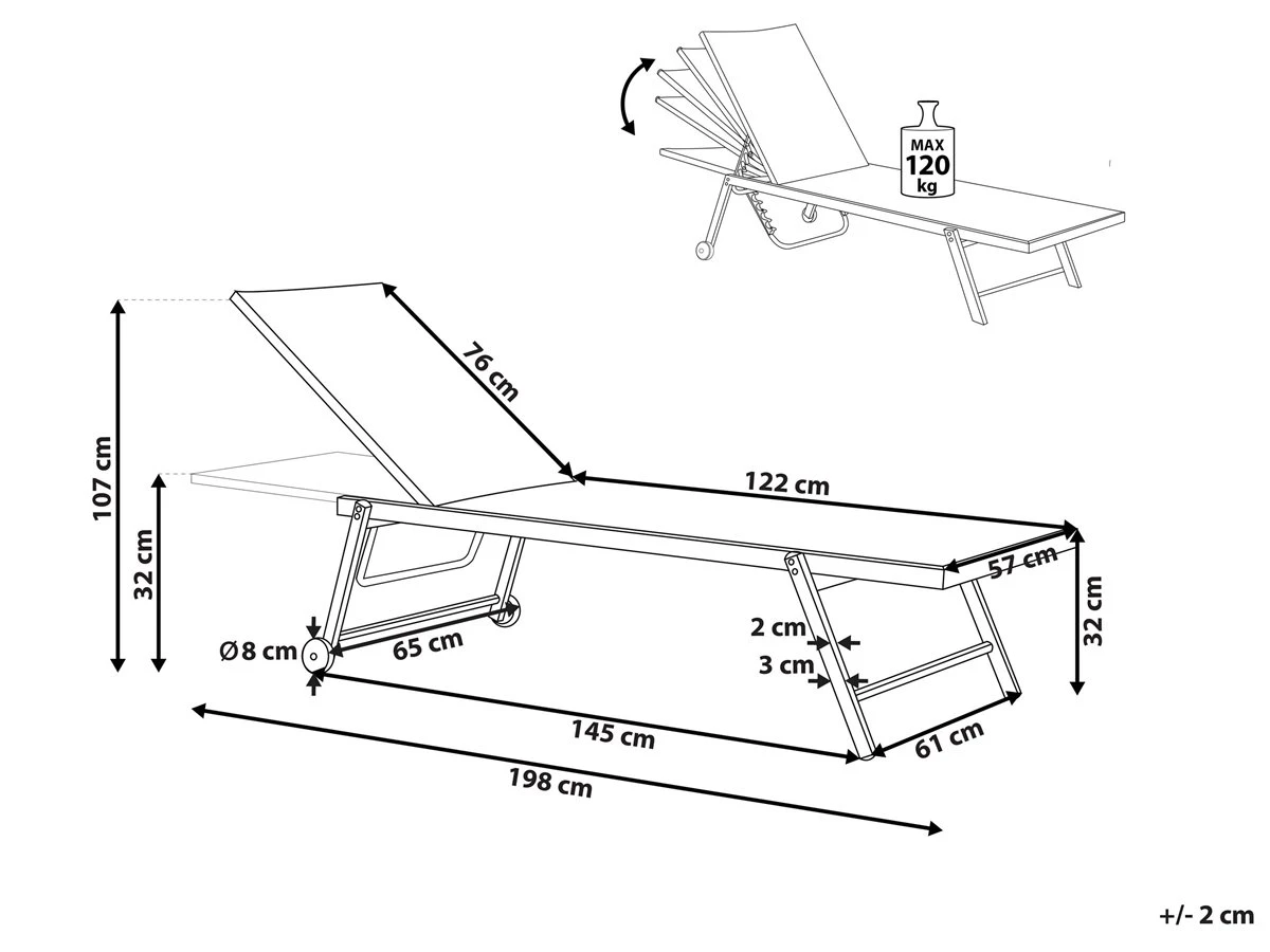 Tumbona de jardín. Disfruta del buen tiempo al aire libre con esta tumbona. Está fabricada a partir de metal ligero y de alta calidad. El material sintético utilizado es duradero y de bajo mantenimiento. El respaldo reclinable da la posibilidad de relajarse leyendo un libro o simplemente tomando el sol. Las ruedas incorporadas facilitan el desplazamiento. Detalles: Tipo de Producto: Tumbona Estilo: Moderno Color: Rosa Tonalidad: Rosa pastel Tipo de material: Material sintético Material principal: Aluminio Composición del Material: 30% Poliéster Respaldo ajustable: Sí Apoyabrazo: No Acabado: Revestimiento en polvo Plegable: No Dimensiones: Profundidad: 65 cm Altura del asiento: 32 cm Ancho: 198 cm Altura: 32-107 cm Peso: 12 kg Capacidad de peso: 120 kg La oferta incluye: 1 x Tumbona de exterior Ventajas: Respaldo ajustable en 5 posiciones, Portátil gracias a las ruedas giratorias, Construcción muy estable, Resistencia UV 5 (ISO 105-B02, Resiste a la intemperie y a todo tipo de clima Información de montaje: Requiere montaje completo. 20-40 min. Texto de resistencia: Los muebles resistentes a los rayos UV muestran una mayor resistencia a la decoloración. Sin embargo, recomendamos que el producto se guarde en el interior cuando no esté en uso. Esto asegurará la máxima durabilidad de los muebles. Resistencia: Rayos UV Consejos de mantenimiento: Textil trenzado: 1.El material es extremadamente resistente a la intemperie. Sin embargo, se recomienda utilizar una funda protectora para la temporada de invierno o, si es posible, guardar los muebles en un lugar fresco y seco 2.Manténgalo alejado de fuentes de calor, como parrilla o fuego, ya que las chispas pueden causar daños graves. No coloque utensilios calientes directamente sobre la superficie, 3.Limpiar con un limpiador a base de jabón suave y un paño suave Aluminio: 1.Limpiar con agua jabonosa y detergentes suaves. Quitar el polvo con un paño suave 2.Fuera de temporada, utilice una funda protectora o guarde los muebles en un lugar fresco y seco.